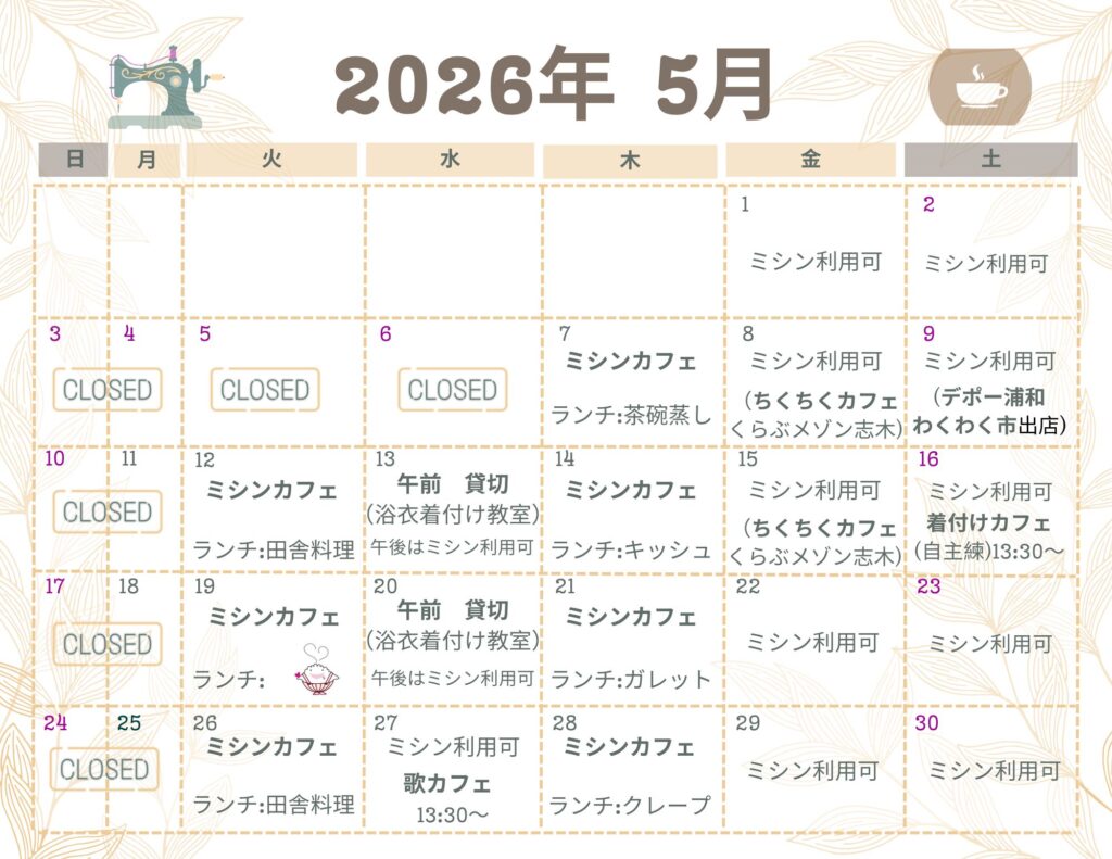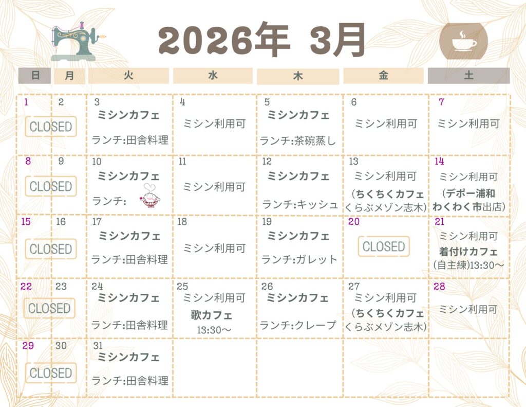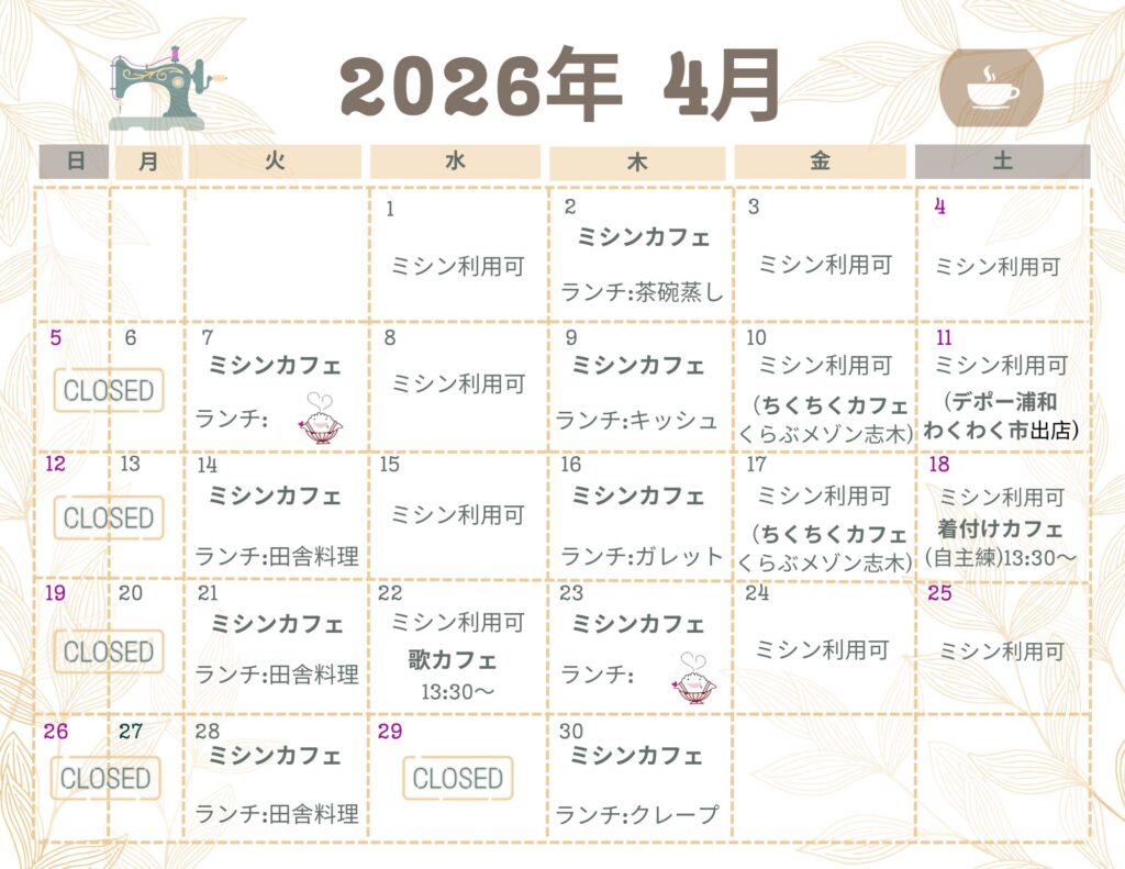 洋裁の指導(ミシンカフェ)をはじめ、ランチやカフェ・手作り品の販売・各種教室の開催などを行なっています。