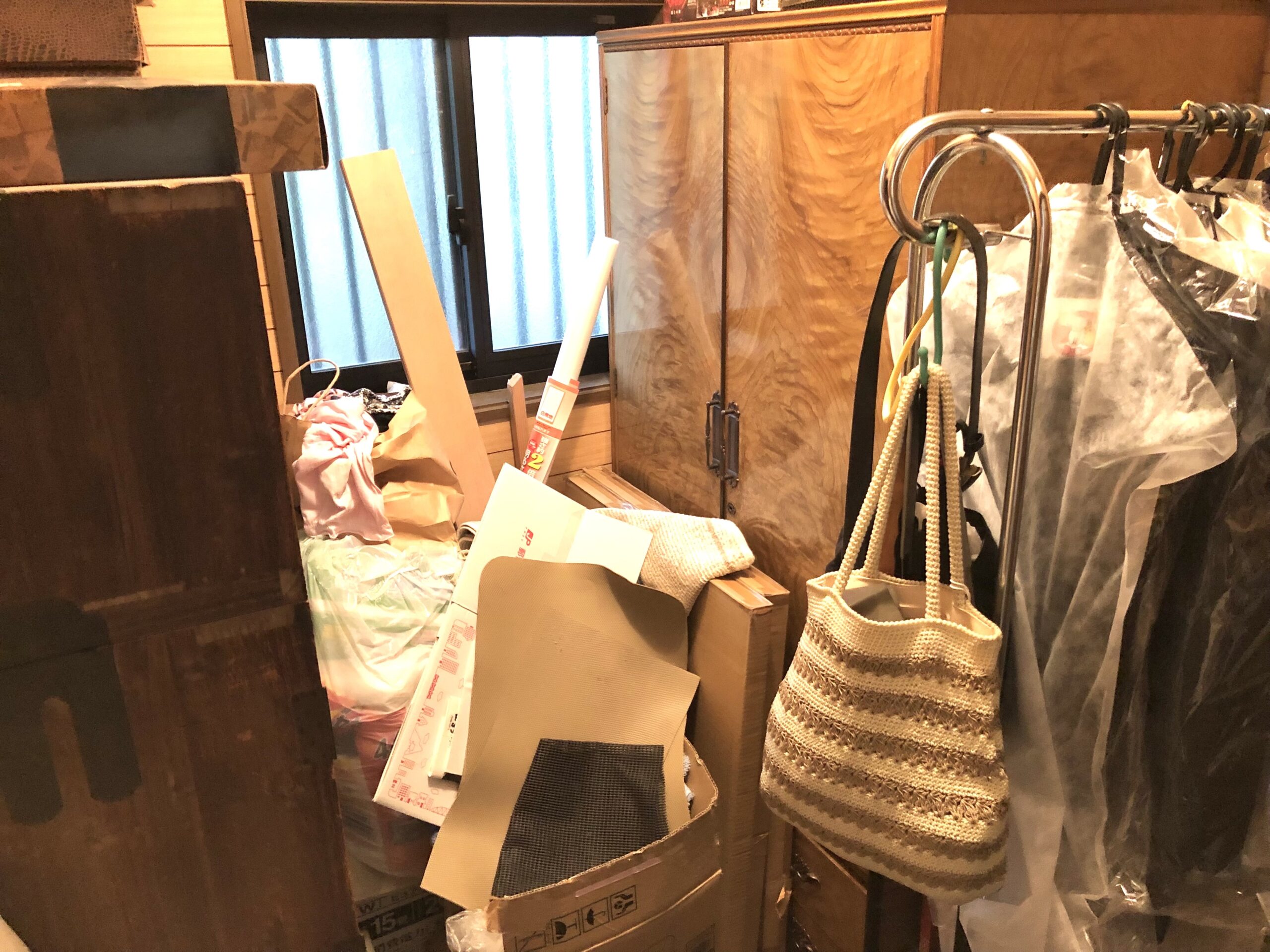 約2畳の納戸にある、和ダンスと洋服ダンスにぎっしり、タンスの上や床に置いた箱にも衣類や季節の家電などがありました。